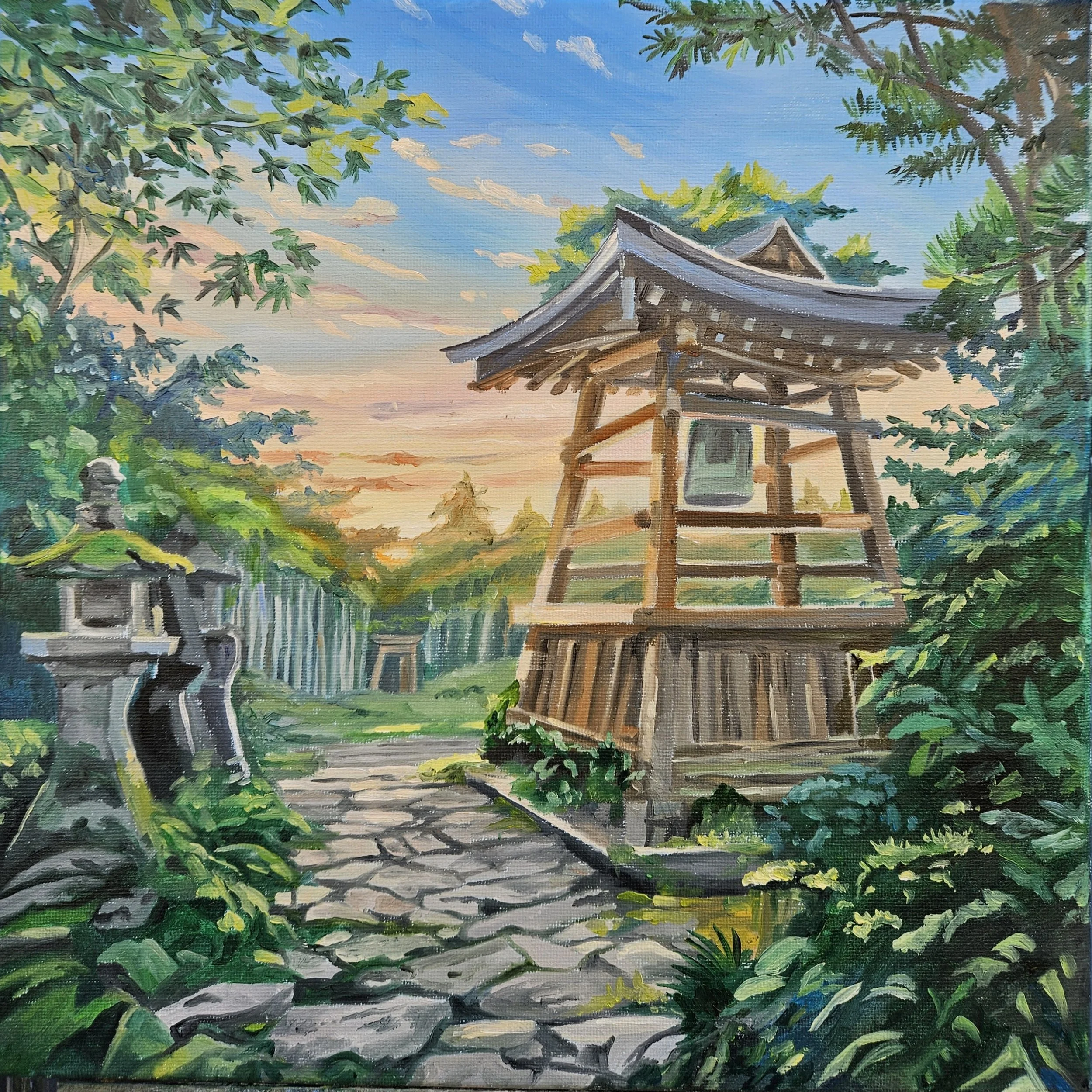My first inspiration for painting Japanese style pictures was owing to a love of the bell towers in the silent temples of the Chiba Ken countryside. Every now and again I shall feature them in a painting. Here, a bell tower is the main focus.