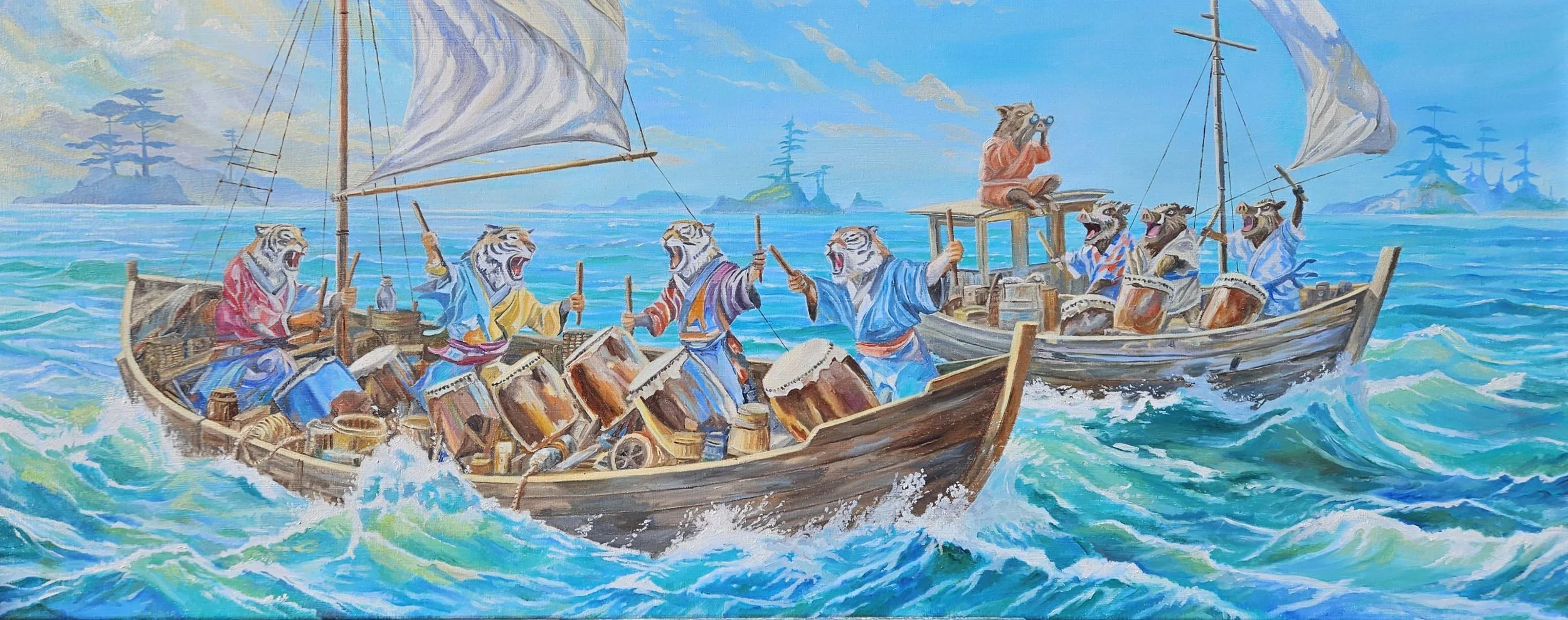 Here, two animals, which figure in the zodiac are drumming on old boats in a zesty sea - perhaps through the Inland Inland Sea. Tigers - Tora and Wild Boar - Inoshishi.