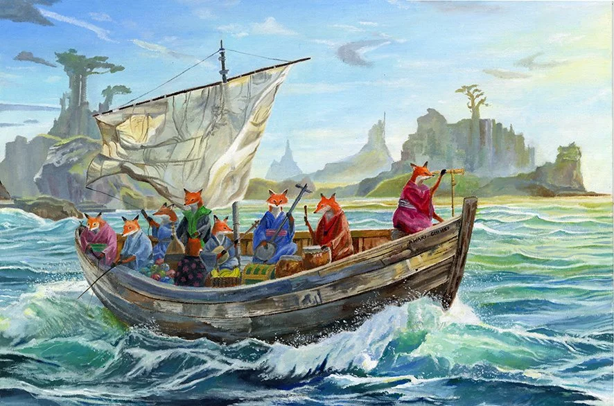 ‘The Pale Horizon’ is the name of the boat the foxes are setting out in. In poetic Japanese it is ‘Awaki Chihei’. Although the islands are fictitious, the islands to the far south of Japan are tropical, remote and exciting to visit. Long ago I flew to Okinawa and from there took a ferry to Kume-jima where I spent a glorious week doing very little more than snorkellling in the coral reefs and breakfasting, dining and enjoying dinner on sashimi.