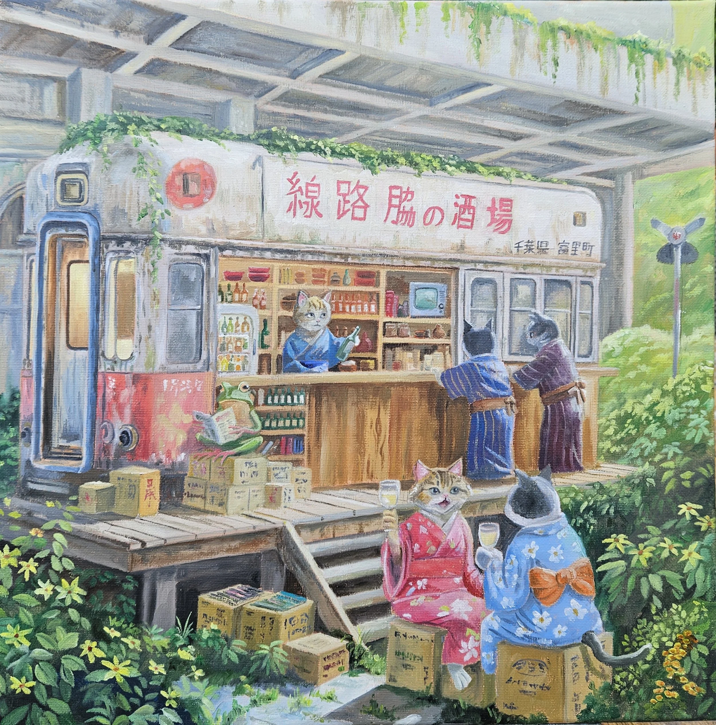 I have always loved trains and train carriages - especially Japanese carriages. Here I have converted a disused train carriage into a bar where animals can sit on boxes and enjoy a drink amongst the undergrowth.