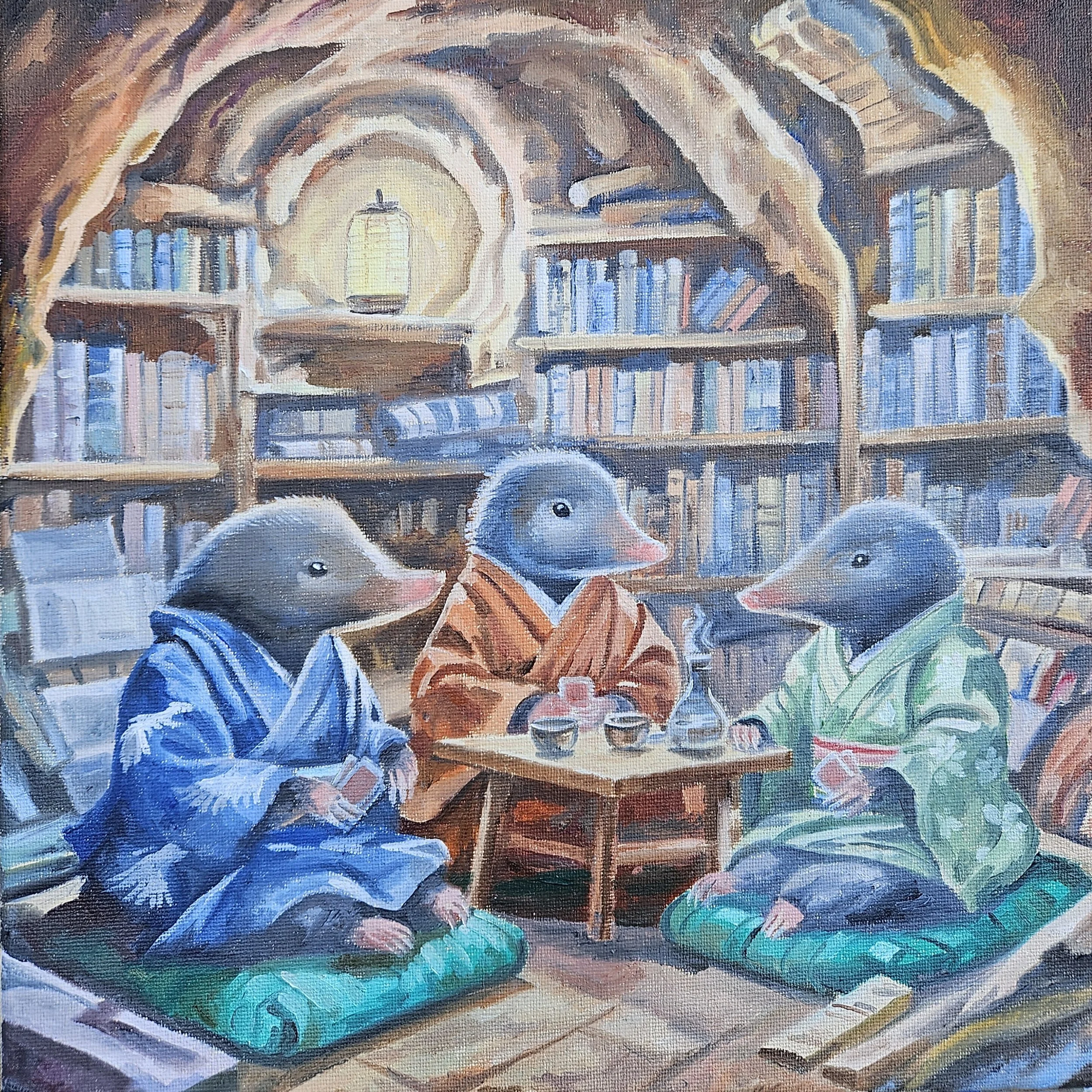 The Trackside BarOil on Canvas 30 cm x 30 cmTime to bring moles into the collection, playing cards over a cup of sake.
